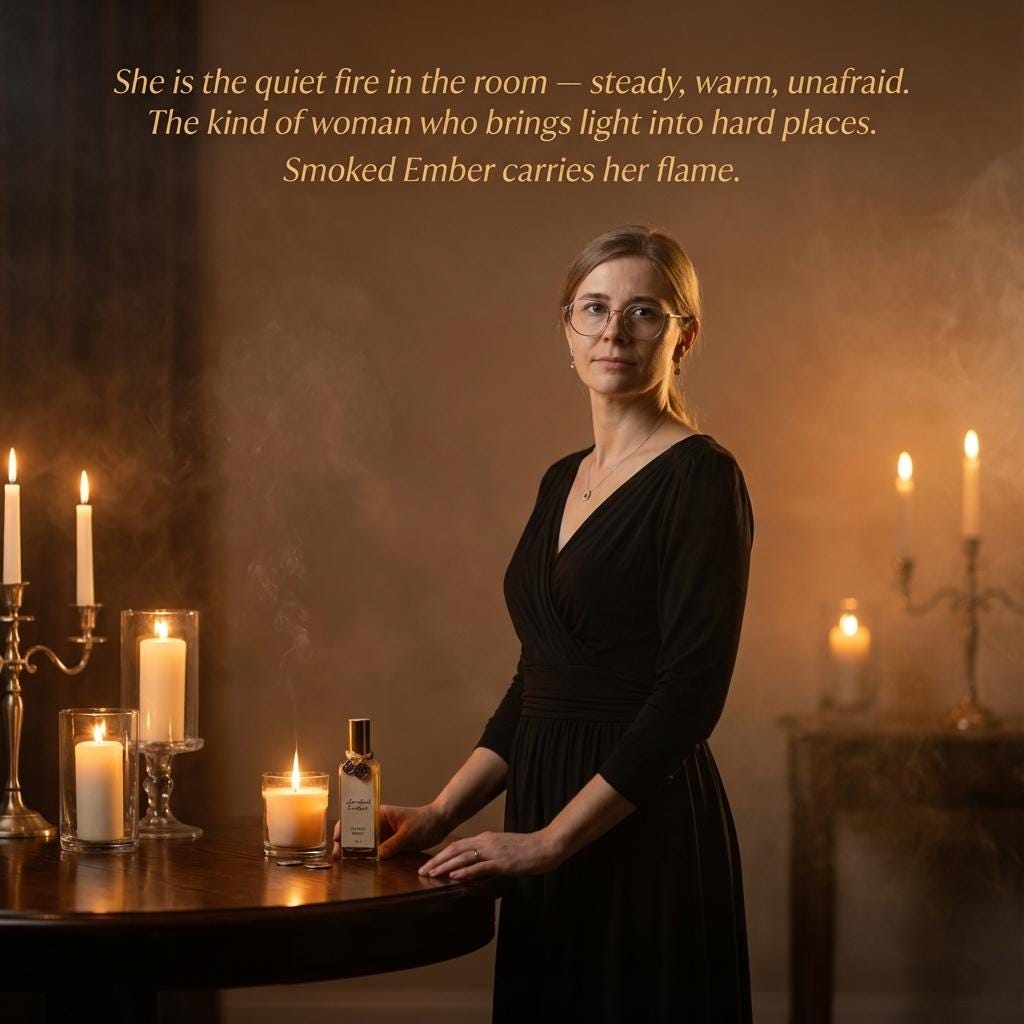 This is the fragrance for people who carry quiet fire — the ones who’ve lived enough life to know that resilience has a scent. Carmen, our real-life social worker and the face of this fragrance, embodies that fire: steady hands, a soft gaze, and a heart that walks into difficult places with warmth instead of fear.