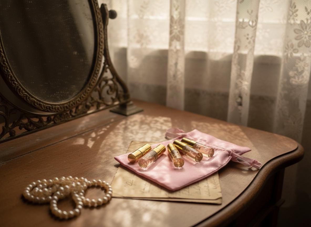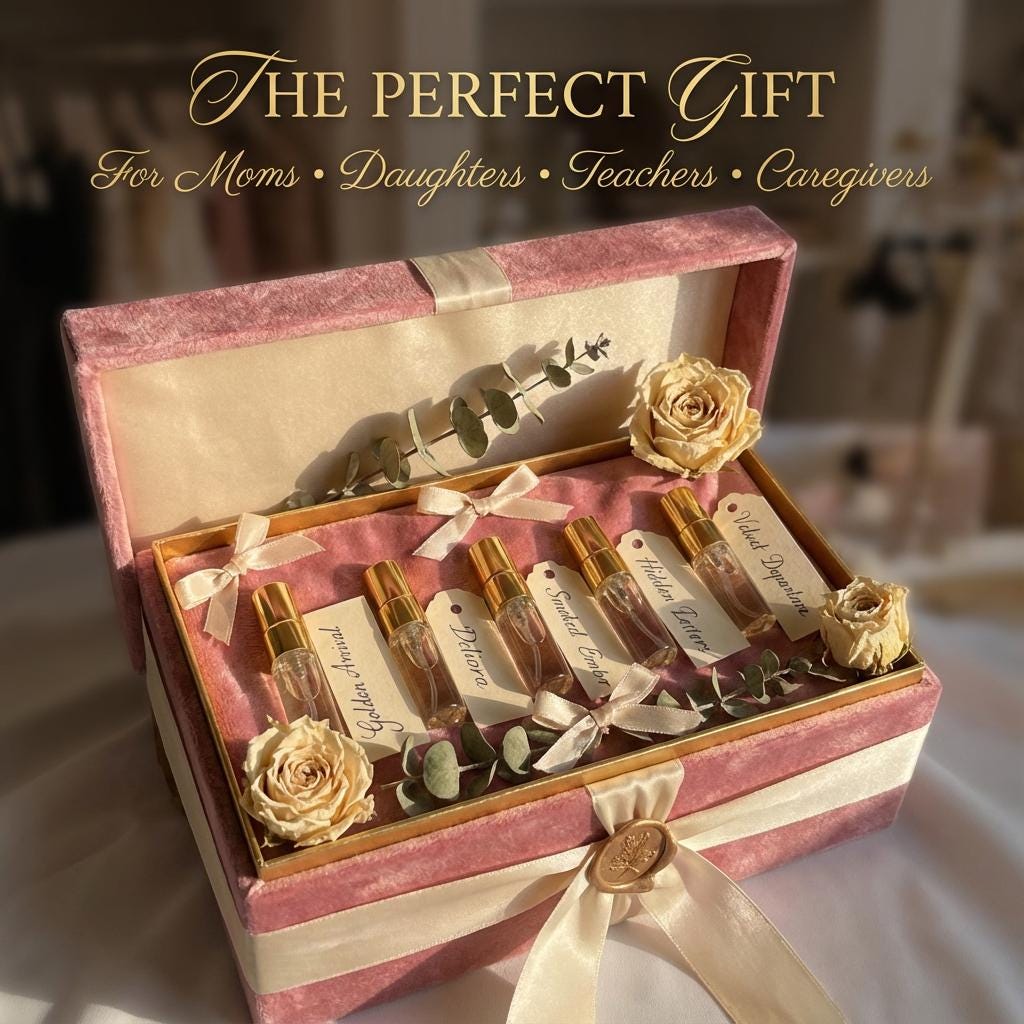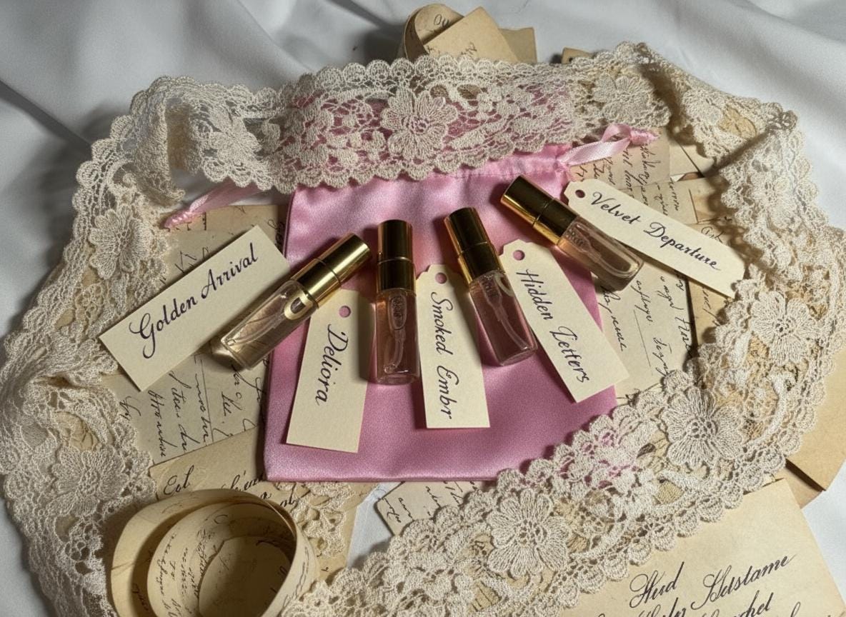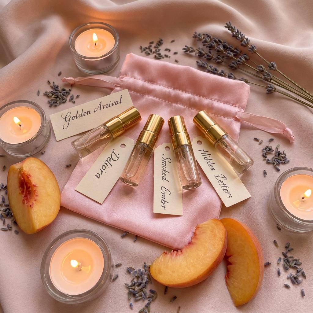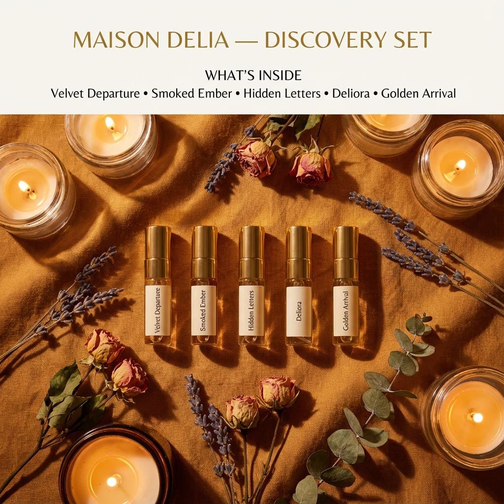This Discovery Set features 5 curated samples from the Maison Delia — warm ambers, soft florals, cozy woods, and luminous musks — each crafted with care, elegance, and story.