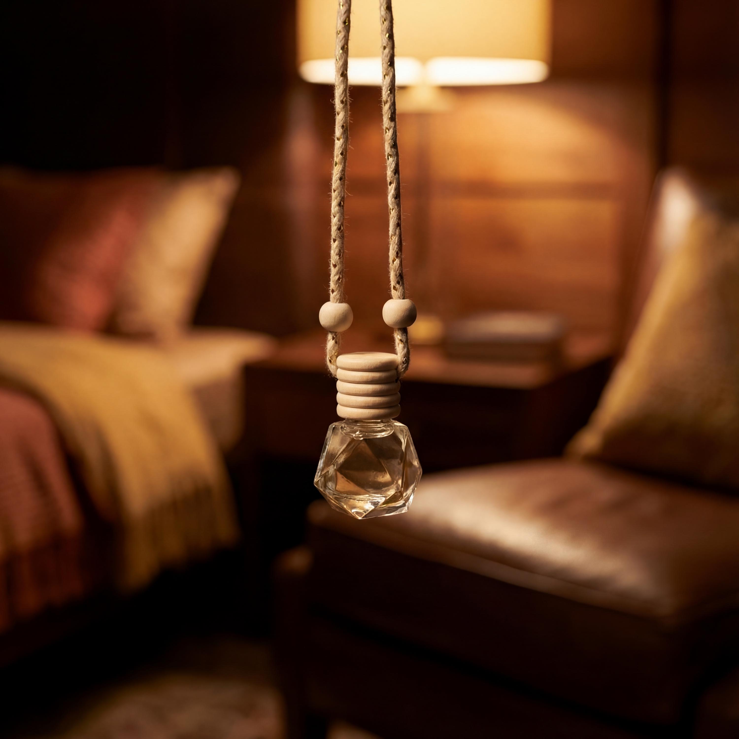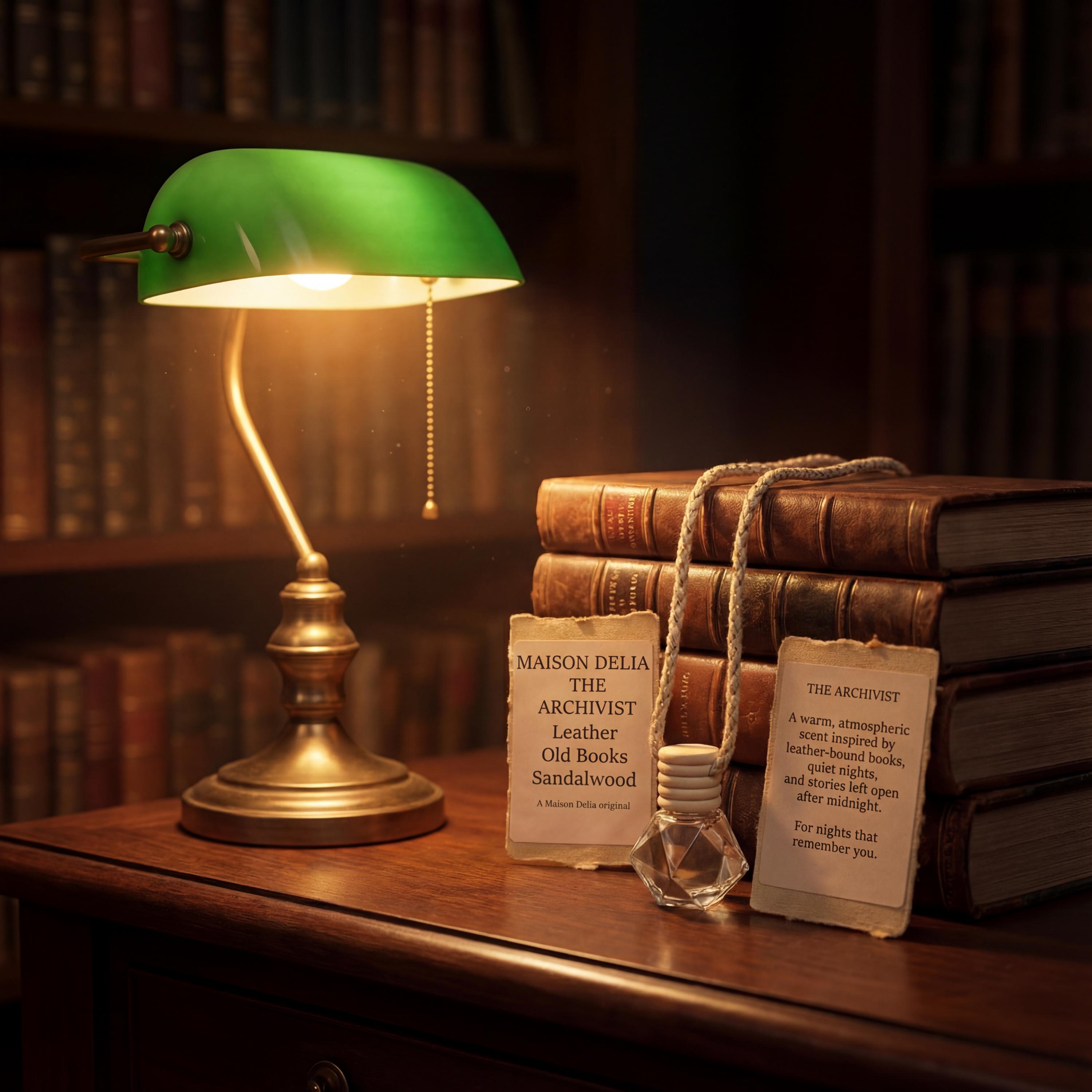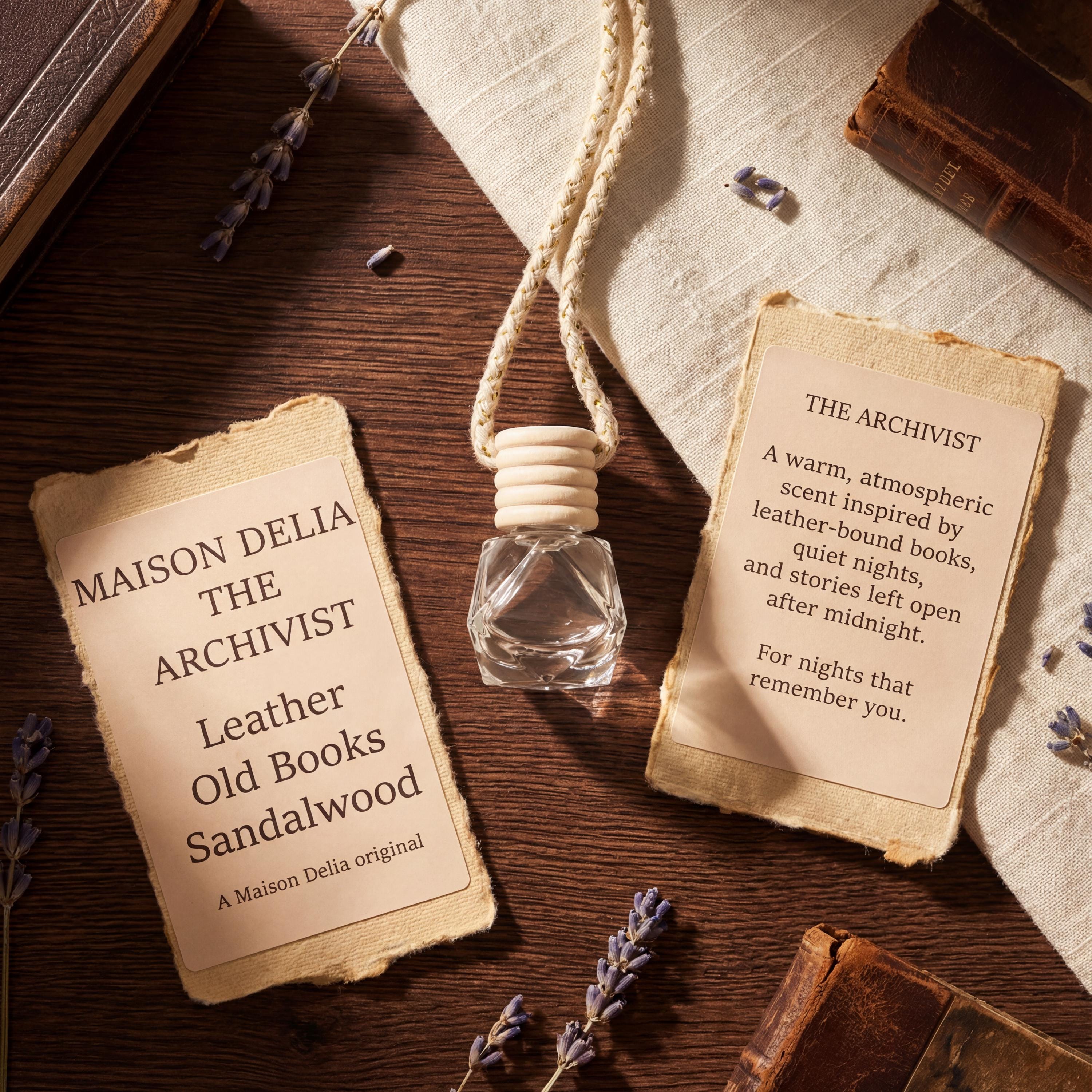 A warm, atmospheric car fragrance inspired by leather-bound books, quiet nights, and stories left open after midnight.